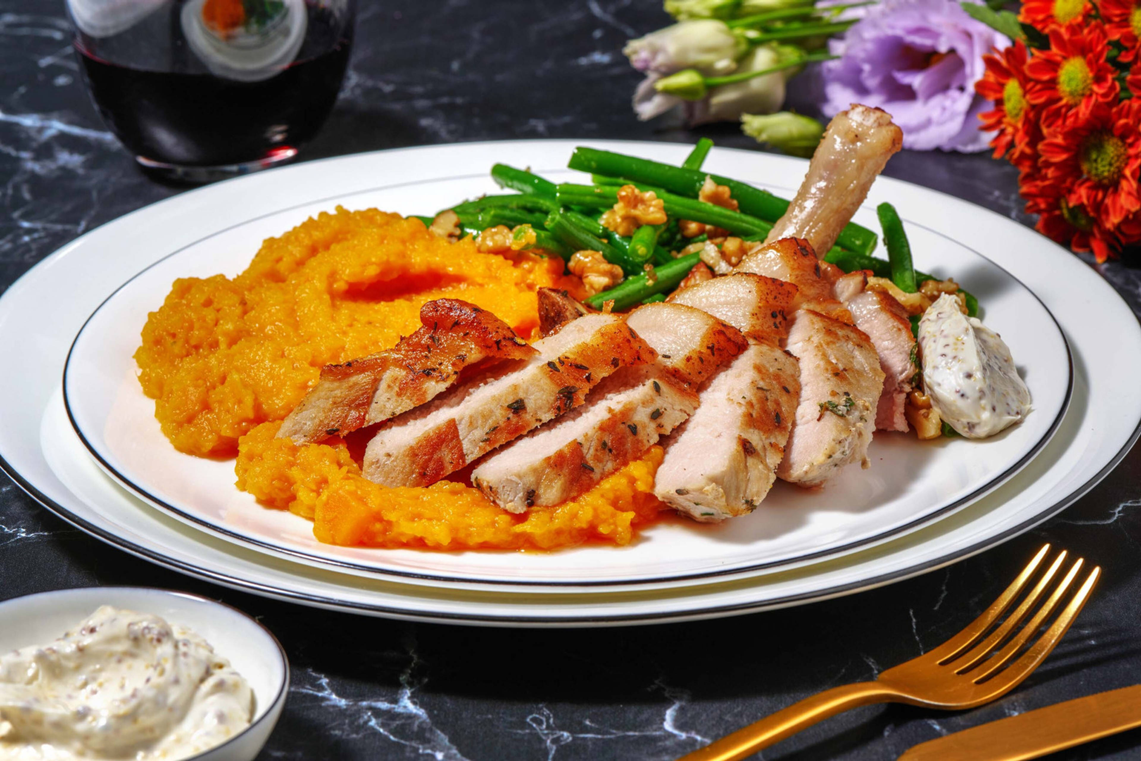 Lorsqu’elle est entièrement cuite, transférer la dinde sur une planche à découper. Couvrir de papier d’aluminium et laisser reposer, 20 min.** Réserver le jus de dinde ayant coulé dans le plat de cuisson pour la sauce. Retirer la ficelle et trancher la dinde. Transférer la dinde dans un plat de service.