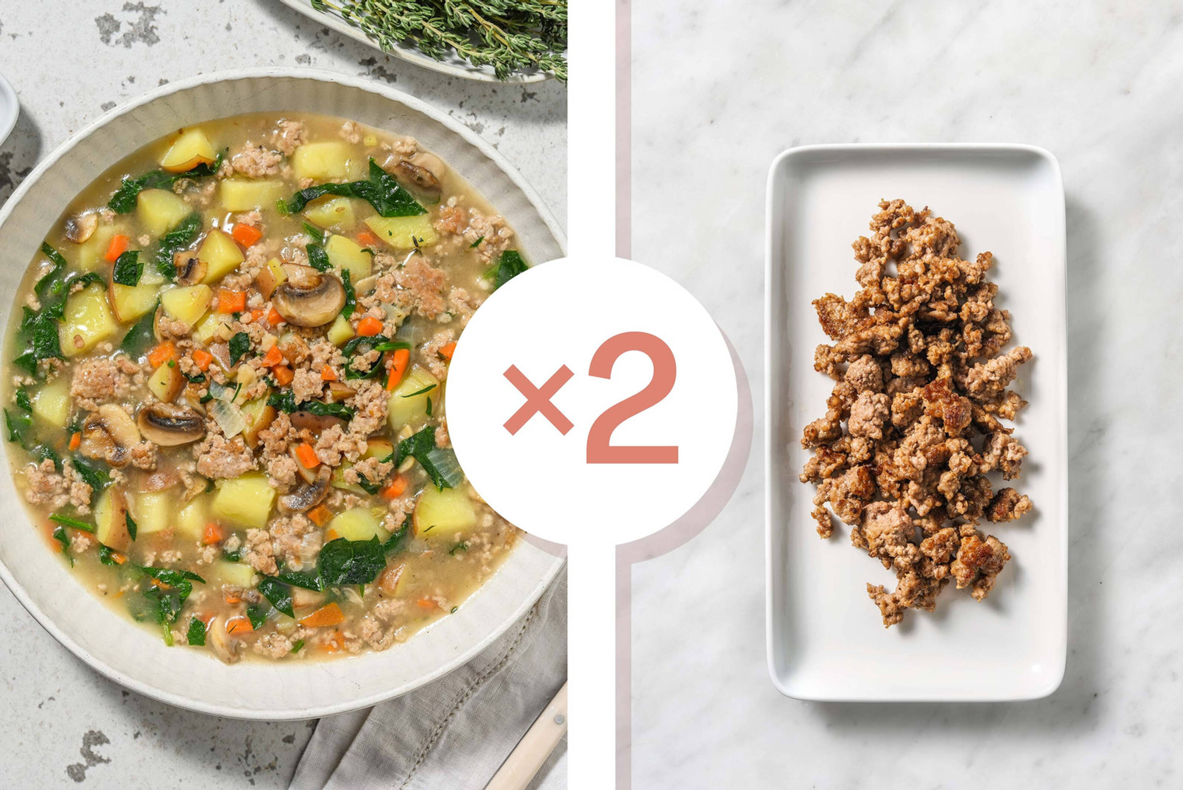 Détacher 1 c. à table de feuilles de thym de leur tige, puis réserver le reste du thym pour la farce. Retirer le rôti de son emballage, puis le sécher avec un essuie-tout. Saupoudrer de thym, puis poivrer. Disposer dans un plat de cuisson de 23 sur 33 cm. Arroser de 1 c. à table d’huile.