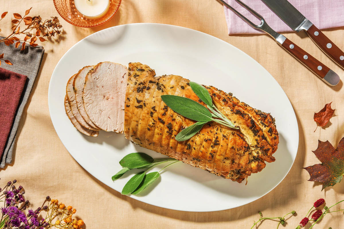 Une dinde désossée, roulée et rôtie à la perfection que vous pourrez découper sans effort. Il suffit de retirer la ficelle après la cuisson et de trancher!