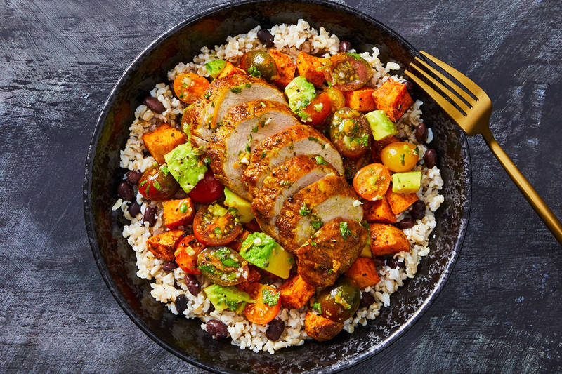 Répartir le chou frisé dans les assiettes. Garnir de maïs grillé, de tomates, d’avocat et de fromage de chèvre aux herbes. Trancher le poulet. Garnir la salade de poulet. Parsemer de bacon. Napper du reste de la vinaigrette.