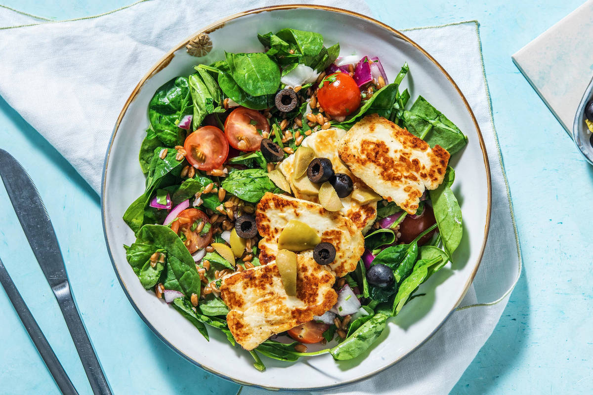 Répartir la salade de farro à la grecqueentre les assiettes et garnir d’haloumi doré.Saupoudrer d’olives hachées.