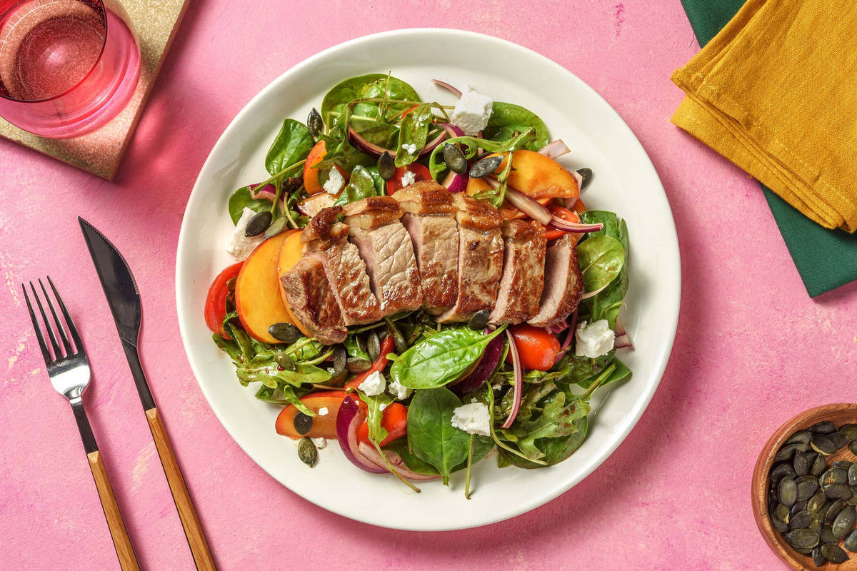 Trancher les steaks finement. Répartir la salade dans les assiettes. Garnir des tranches de steak. Parsemer de feta et de graines de citrouille.