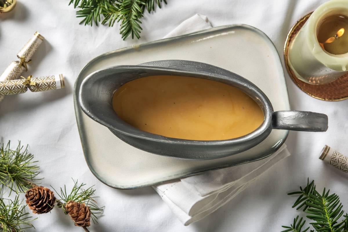 Ajouter le jus de dinde réservé, la demi-glace, 1 1/2 tasse d’eau, et 1/2 c. à thé de sel. Mijoter en fouettant souvent jusqu’à ce que la sauce réduise, de 2 à 3 min.