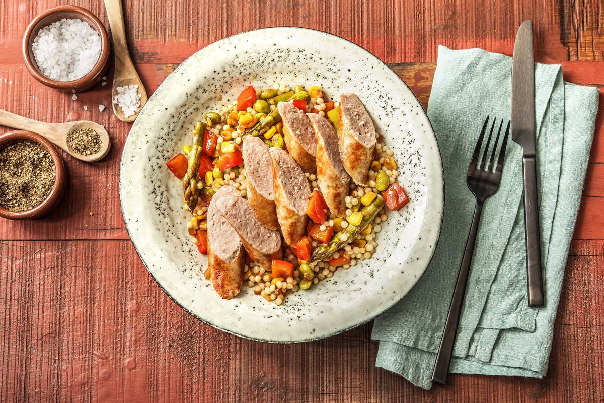 Succotash is a hearty Southern vegetable dish that traditionally contains corn and lima beans. We're switching up the beans for edamame, and tossing it up with bell peppers and Israeli couscous! Seared honey-garlic sausage pairs perfectly with this vegetable medley.