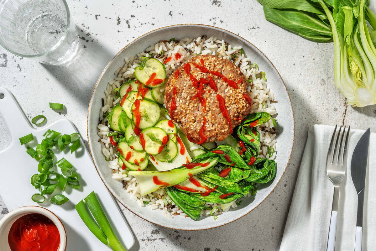 Fluff rice with a fork. Stir in remaining green onions. Divide rice between bowls. Top with patties, bok choy and marinated cucumbers. Drizzle sriracha over top.