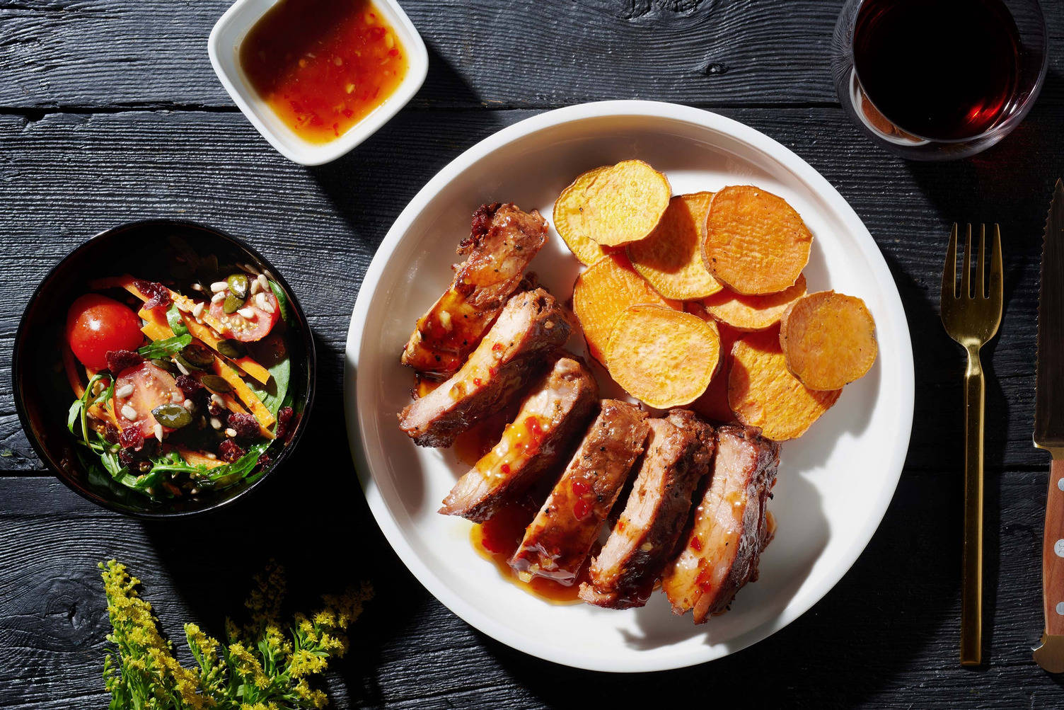Get ready for your taste buds to be fired up! Riffing off of a classic meat and two, its saucy grilled ribs, cheesy macaroni pie and summery corn- BBQ pit stop vibes all in the comfort of your own home!