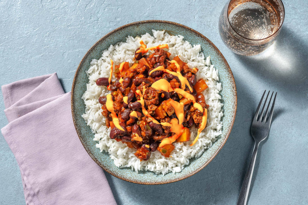 This veggie 'jambalaya' is wholesome, bursting with flavour and packed with protein from both kidney beans and Beyond Meat®. The veggies and protein are simmered in a tomato-based sauce before being draped over basmati rice and finished off with a creamy kick from spicy mayo.