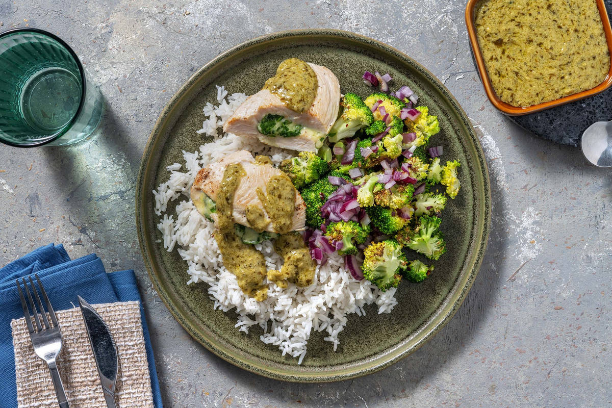 We love stuffed chicken here at HelloFresh! Mozzarella and spinach stuffed chicken breasts get an upgrade with a finishing drizzle of pesto sauce. This stuffed chicken dream is served over fluffy basmati rice.