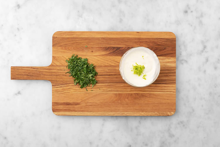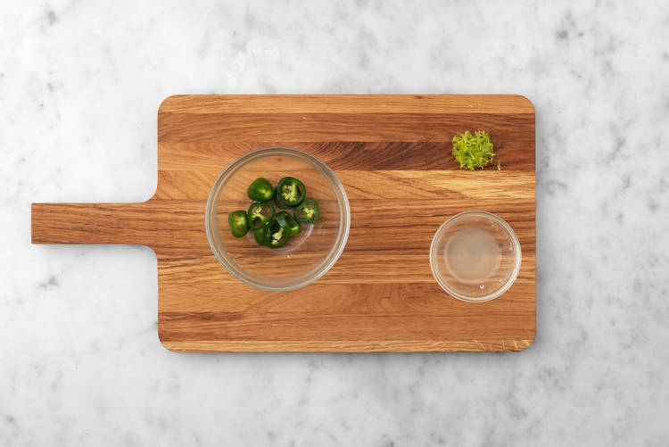 Before starting, preheat the oven to 450ºF. Wash and dry all produce. Heat Guide for Step 4: a quarter of the jalapeños for mild, half for medium, all the jalapeños for spicy! Zest, then juice lime. Thinly slice jalapeño into 1/8-inch half-moons, removing seeds for less heat. (TIP: We suggest using gloves when prepping jalapeños!)Add vinegar, jalapeños, 2 tbsp water, 2 tsp sugar and 1/4 tsp salt to a small pot. (NOTE: Reference heat guide.) Bring to a simmer over medium-high heat. Cook, stirring often, until sugar dissolves, 1-2 min. Remove the pot from heat. Transfer jalapeños, including liquid, to a small bowl. Set aside in the fridge to cool.