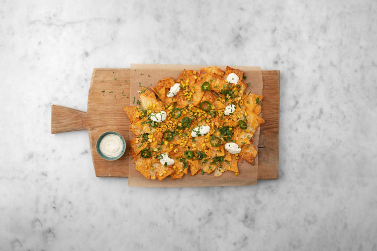 These fun nachos are reminiscent of savoury street corn. Spicy pickled jalapeños, charred corn, zesty lime and herby cilantro make for a delicious appetizer that's perfect for sharing (although you may not want to!) Ingredients: Tortilla chips (whole grain corn, white corn, corn masa flour, water, vegetable oil, salt, calcium hydroxide) • Mozzarella cheese (pasteurized milk, modified milk ingredients, water, cream, salt, fructose, calcium chloride, bacterial culture, microbial enzyme, microbial rennet, citric acid, sodium phosphate, sodium citrate, potassium sorbate, cellulose, natamycin) (milk) • Thaw-friendly corn (corn, modified vinegar) • Sour cream (milk ingredients, modified milk ingredients, modified cornstarch, sodium phosphate, sodium citrate, carrageenan, locust bean gum, guar gum, microbial enzyme, bacterial culture) (milk) • Limes • Cheddar cheese (pasteurized milk, modified milk ingredients, cream, bacterial culture, salt, annatto, beta-carotene, calcium chloride, microbial enzyme, cellulose, natamycin) (milk) • White wine vinegar (wine vinegar, potassium metabisulfite) (sulphites) • Jalapeno pepper • Enchilada spice blend (spices, sugar (sugar, maltodextrin), salt, garlic powder, tomato powder, paprika powder, citric acid, canola oil, oleoresin paprika, silicon dioxide) (sulphites) • Cilantro.