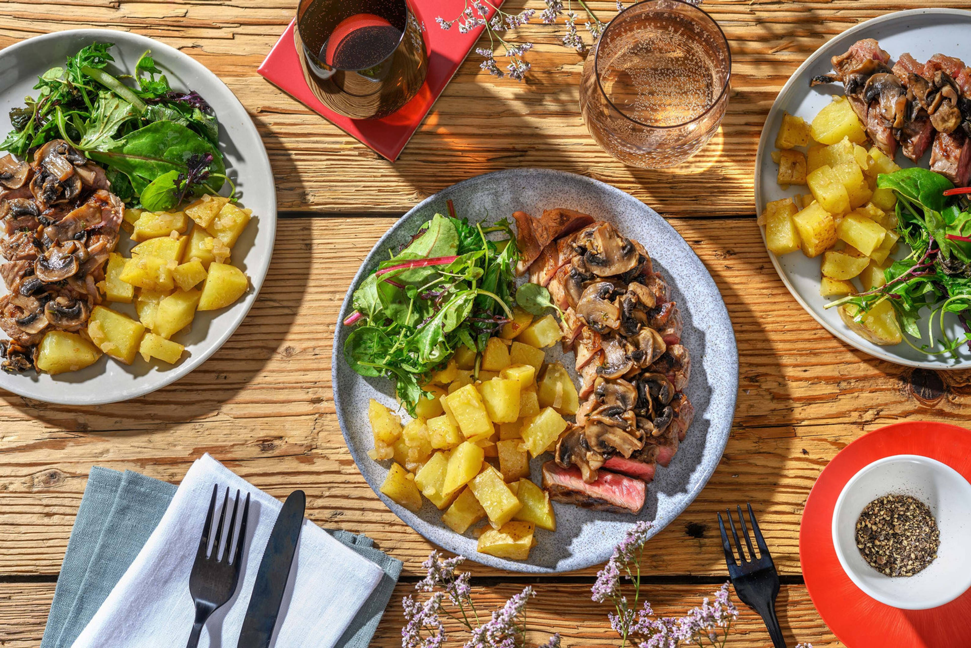 • Répartir le steak, les pommes de terre et les pois sucrés dans les assiettes.
