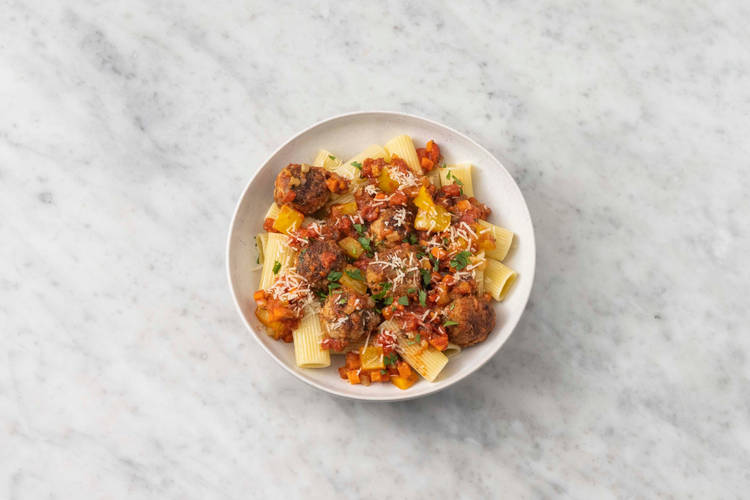 This Sunday sauce-style pasta is like a heartwarming hug, perfect after a long day. The ridges on the rigatoni pasta ensure no sauce gets left behind. Time to dig in!
