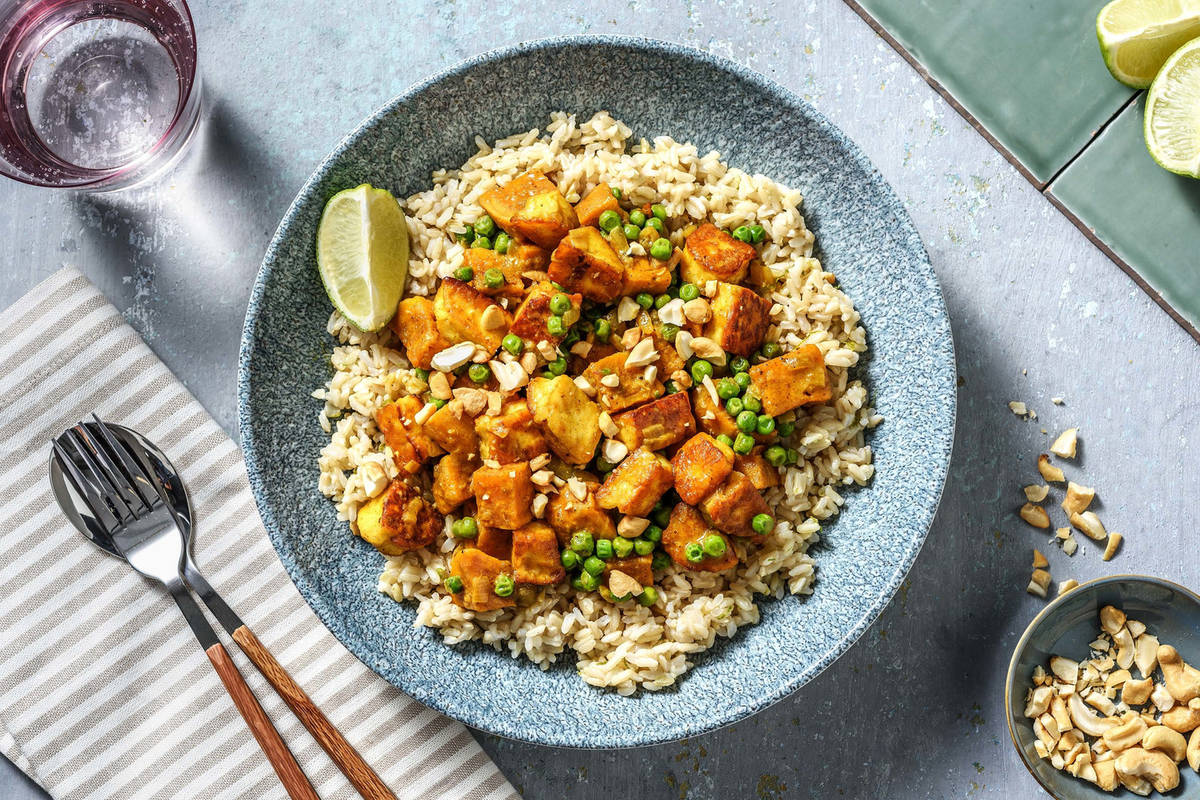 While rice cooks, cut paneer into 1/2-inch cubes. Heat a large non-stick pan over medium heat. When hot, add cashews to the dry pan. Toast, stirring often, until golden, 1-2 min. Transfer to a plate and set aside. Add paneer to the same pan. Pan-fry, tossing occasionally, until crispy and golden-brown, 4-5 min. Transfer to another plate and set aside.