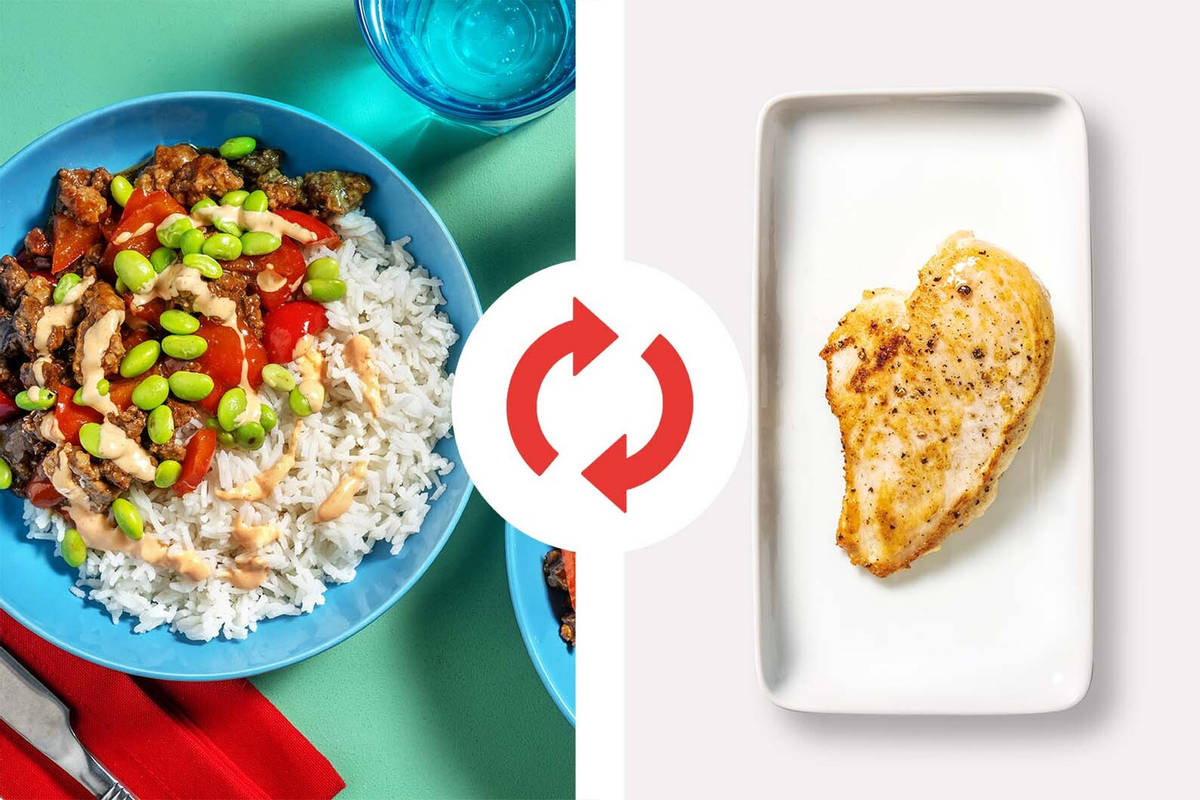 This speedy dinner is packed with flavour and texture from sweet teriyaki chicken, tender-crisp stir-fried peppers and pops of edamame. Top it all off with the sriracha mayo drizzle for a deliciously creamy kick!