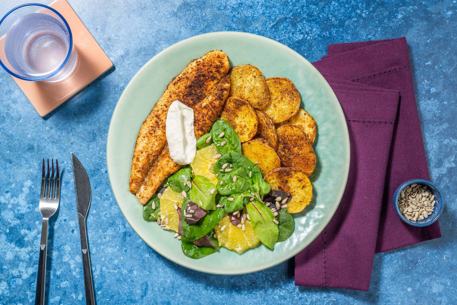 • Répartir le tilapia, les pommes de terre et les pois sucrés dans les assiettes.• Servir la sauce au yogourt comme trempette.• Arroser du jus d’un quartier de citron, si désiré.