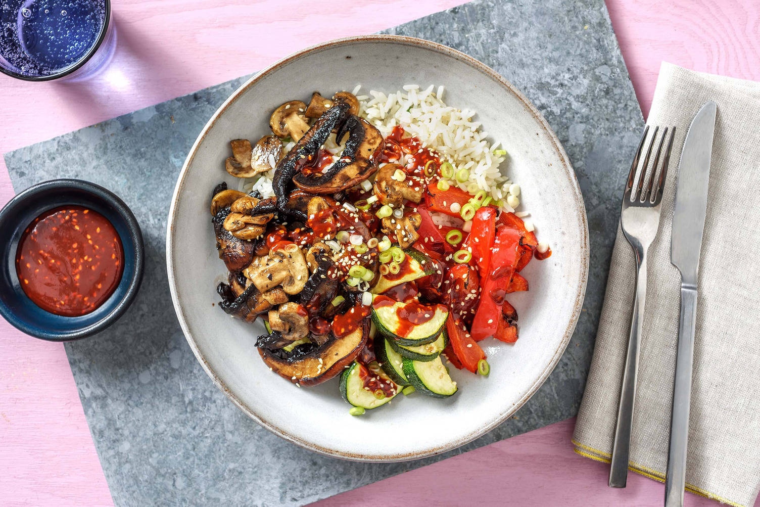 Cette recette est l’exemple même d’une réussite sucrée-salée. La tartinade de figues sucrées recouvre du tofu juteux et garantit à toute la famille un repas fantastique ce soir ! Ingrédients : Tofu (soya non OGM, eau, nigari) (soya) • Courgette • Carottes • Riz étuvé • Pois sucrés • Tartinade de figues (sucres (sucre, glucose, figues séchées), eau, amidon de maïs modifié, sel, pectine, acide citrique, acide ascorbique, sorbate de potassium, benzoate de sodium) • Bouillon de poulet en poudre (sel, sucres (dextrose, extrait sec de sirop de maïs, sucre), graisse de poulet, amidon de maïs, protéines végétales hydrolysées(maïs, soja), oignon déshydraté, extrait de levure, épices et herbes, extraits d'épices, poulet déshydraté, acide citrique, extrait de curcuma, curcuma, inosinate disodique, guanylate disodique, arôme naturel) (soya) • Mélange d’épices acidulé à l’ail (ail granulé, semoule de maïs, sel, flocons de poivrons déshydratés, épices, sucre, fines herbes, huile de canola, dioxyde de silicium, acide citrique) (sulfites).