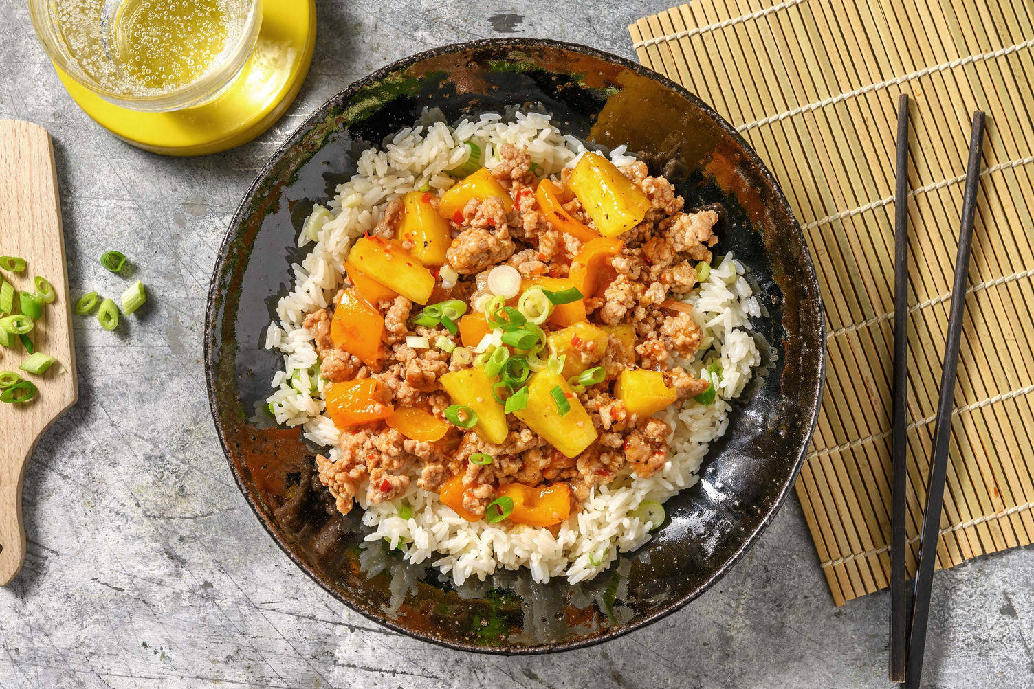 • Répartir le riz, le porc et les légumes dans les assiettes.