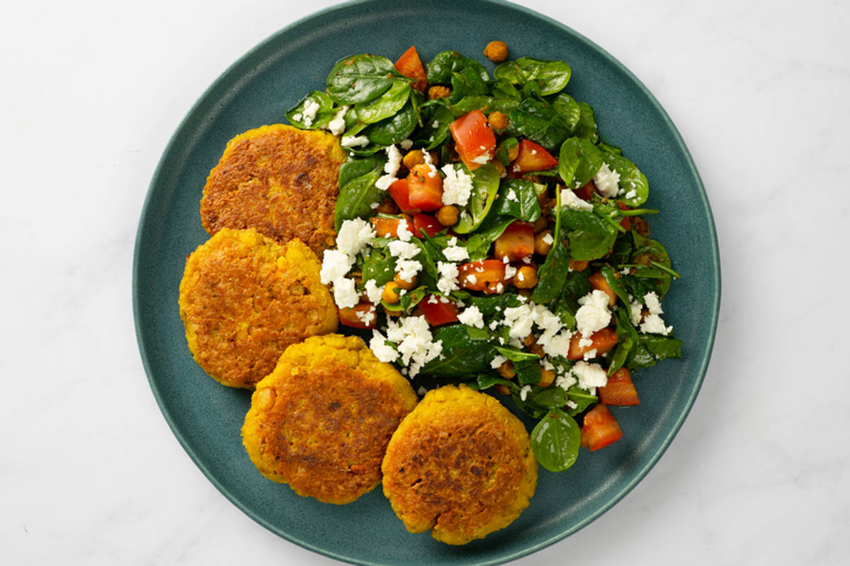 Ingredients: Chickpeas (chickpeas, water, salt, ascorbic acid, disodium EDTA) • Tofu (non-GMO soybean, water, calcium sulfate, magnesium chloride) (soy) • Roma tomato • Spinach • Grade A egg • Feta cheese (milk) (pasteurized milk, partly skimmed milk, modified milk ingredients, water, salt, lipase, bacterial culture, microbial enzyme, cellulose, potassium sorbate, lactic acid, natamycin, calcium chloride) • Middle Eastern spice blend (mustard) (spices, paprika powder, salt, sugar (corn syrup solids, sugar), garlic powder, black pepper, mustard ground, canola oil, oleoresin paprika, silicon dioxide) • Red wine vinegar • Cumin-turmeric blend (cumin, turmeric, silicon dioxide).