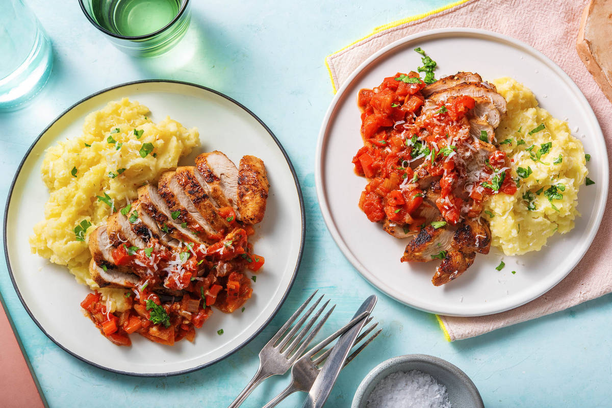 Thinly slice the turkey. Divide the mash potatoes between plates. Top with the turkey, then the tomato-pepper sauce. Sprinkle over the parsley and the remaining Parmesan.