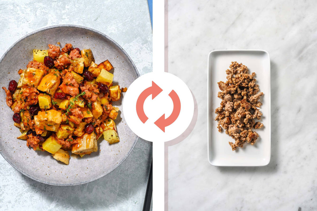 Heat a large oven-proof pan over medium-high heat. When hot, add 1 tbsp (2 tbsp) oil, then mirepoix and apples. Cook, stirring occasionally, until softened, 3-4 min. Add turkey. Cook, breaking up turkey into smaller pieces, until no pink remains, 3-5 min.** Season with salt and pepper.