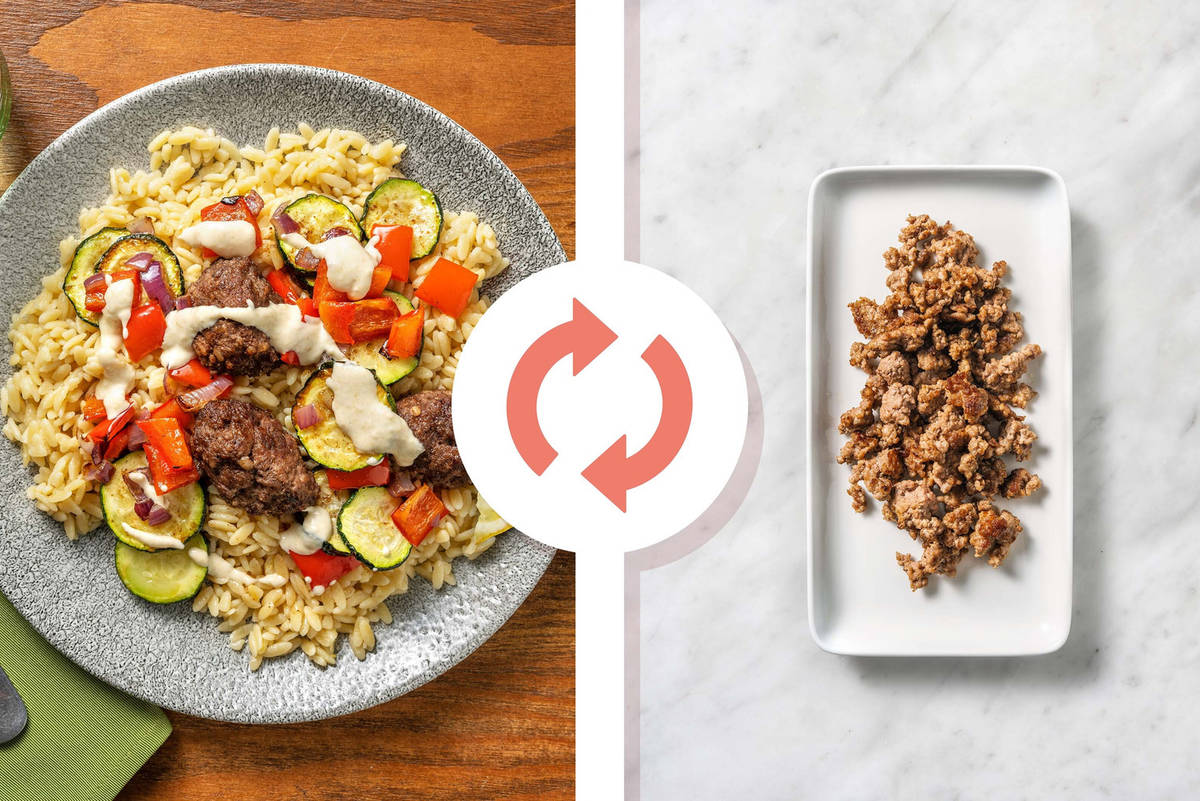 2023 is the year of the tray bake! Layers of zucchini, peppers and shawarma-spiced koftas get baked to perfection, then piled on top of orzo and finished with lemony garlic-hummus sauce.