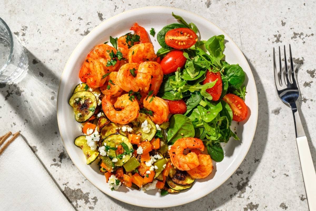 Ingredients: Salmon fillets • Zucchini • Green pepper • Sweet bell pepper • Baby tomato • Lemon • Arugula and spinach mix • Feta cheese (milk) (pasteurized milk, partly skimmed milk, modified milk ingredients, water, salt, lipase, bacterial culture, microbial enzyme, cellulose, potassium sorbate, lactic acid, natamycin, calcium chloride) • Balsamic vinegar (sulphites) (wine vinegar, cooked grape must, grape juice concentrate, caramel colour, natural flavour, sulphites) • Parsley • Garlic • Smoked paprika-garlic blend (sulphites) (smoked paprika, garlic powder, silicon dioxide) • Chili pepper.